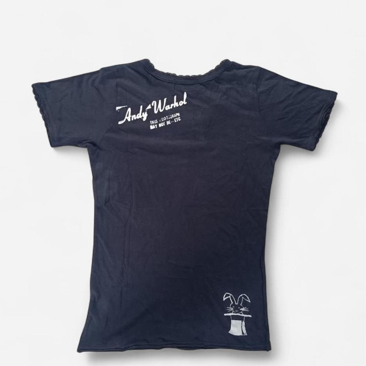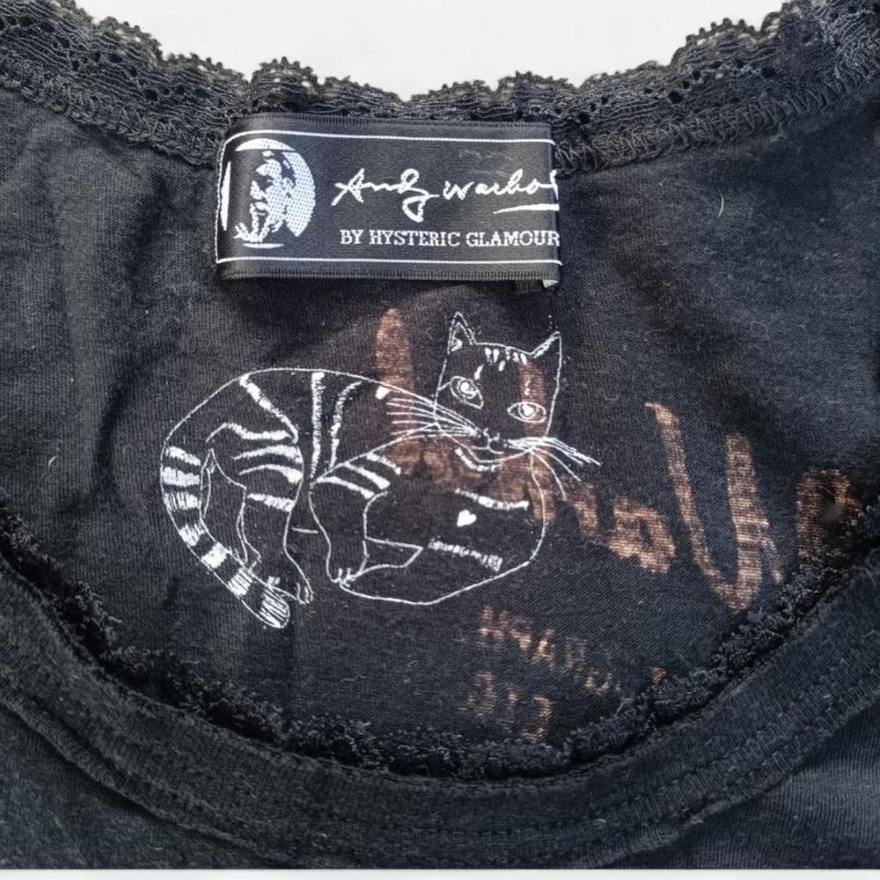 Super rare Hysteric Glamour x Andy Warhol black cotton tee featuring a playful cat motif and delicate lace trim. This 2004–2005 Japanese import is a collectible Y2K streetwear piece, perfect for fans of pop art, alternative fashion, and rare Hysteric archive items.